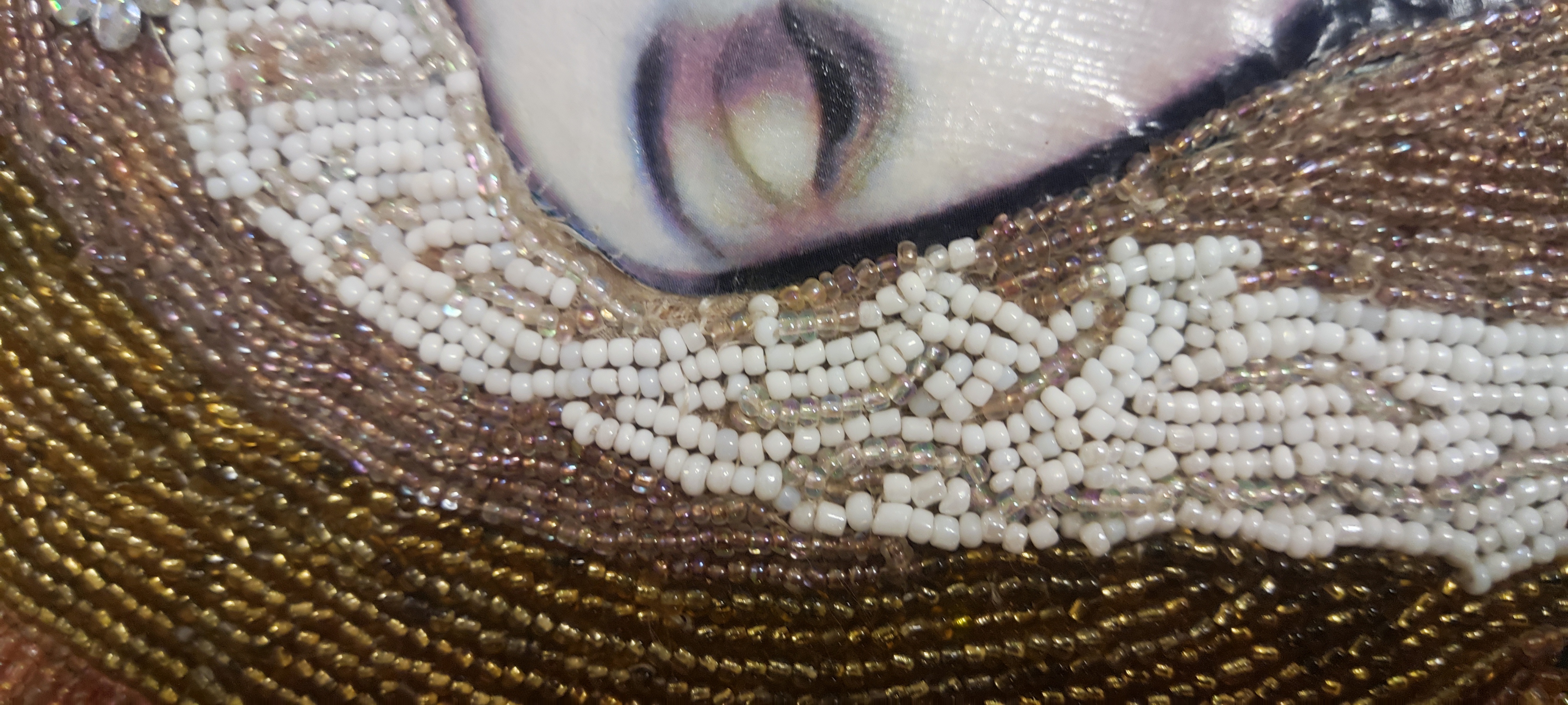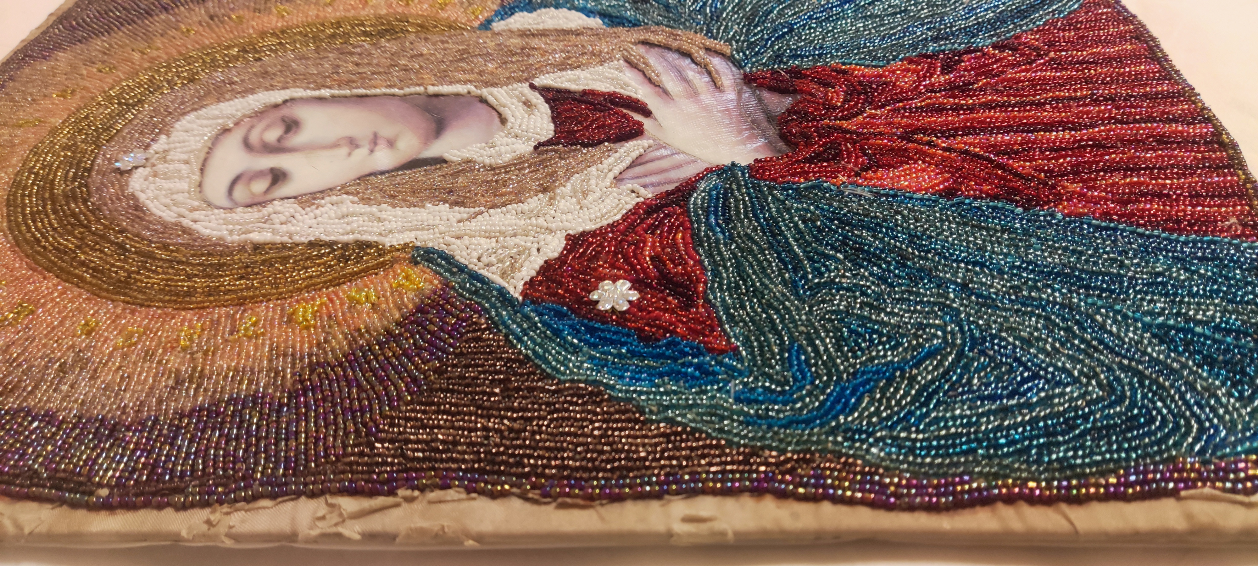 Но на мой взгляд - бисерная выкладка весьма примитивная: одинаковые бусинки нанизываются подряд на нитку, затем укладываются и закрепляются по участкам на канве с напечатанным ликом и контурами для нашивания бисера. Старательная девочка-школьница справится с одной подобной работой за несколько часов. Да и материал не очень похож на качественный и дорогой...