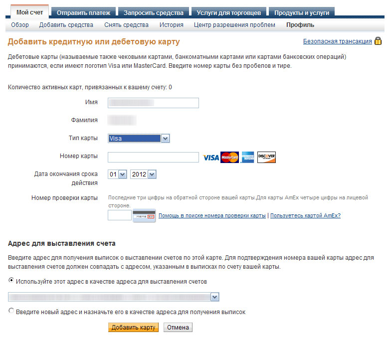 Заполняем выпавшую форму. Если вы хотите покупать в зарубежных магазинах имя и адрес пишем на латинице. Впрочем, потом это можно будет поправить. "согласен и открываю счет"