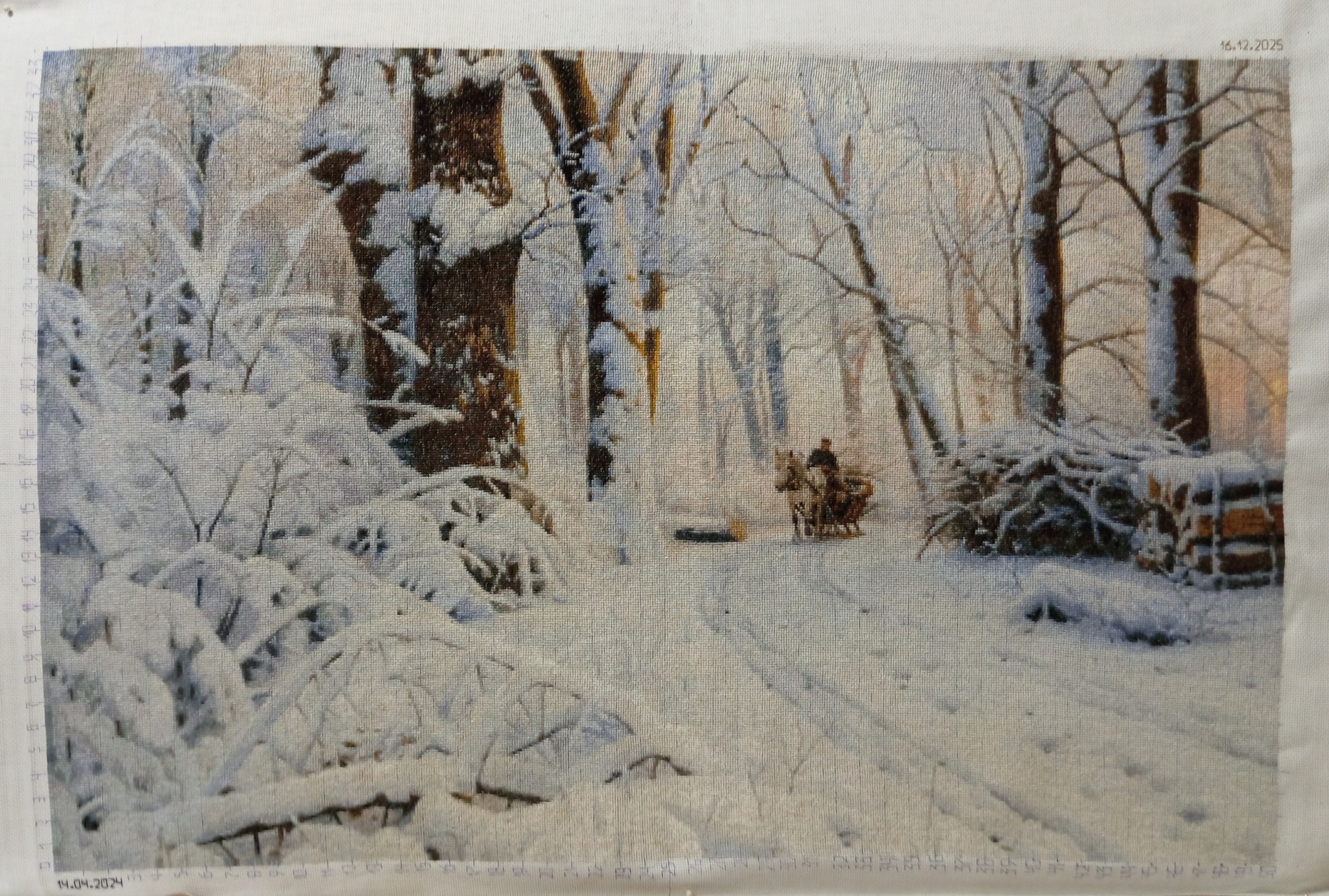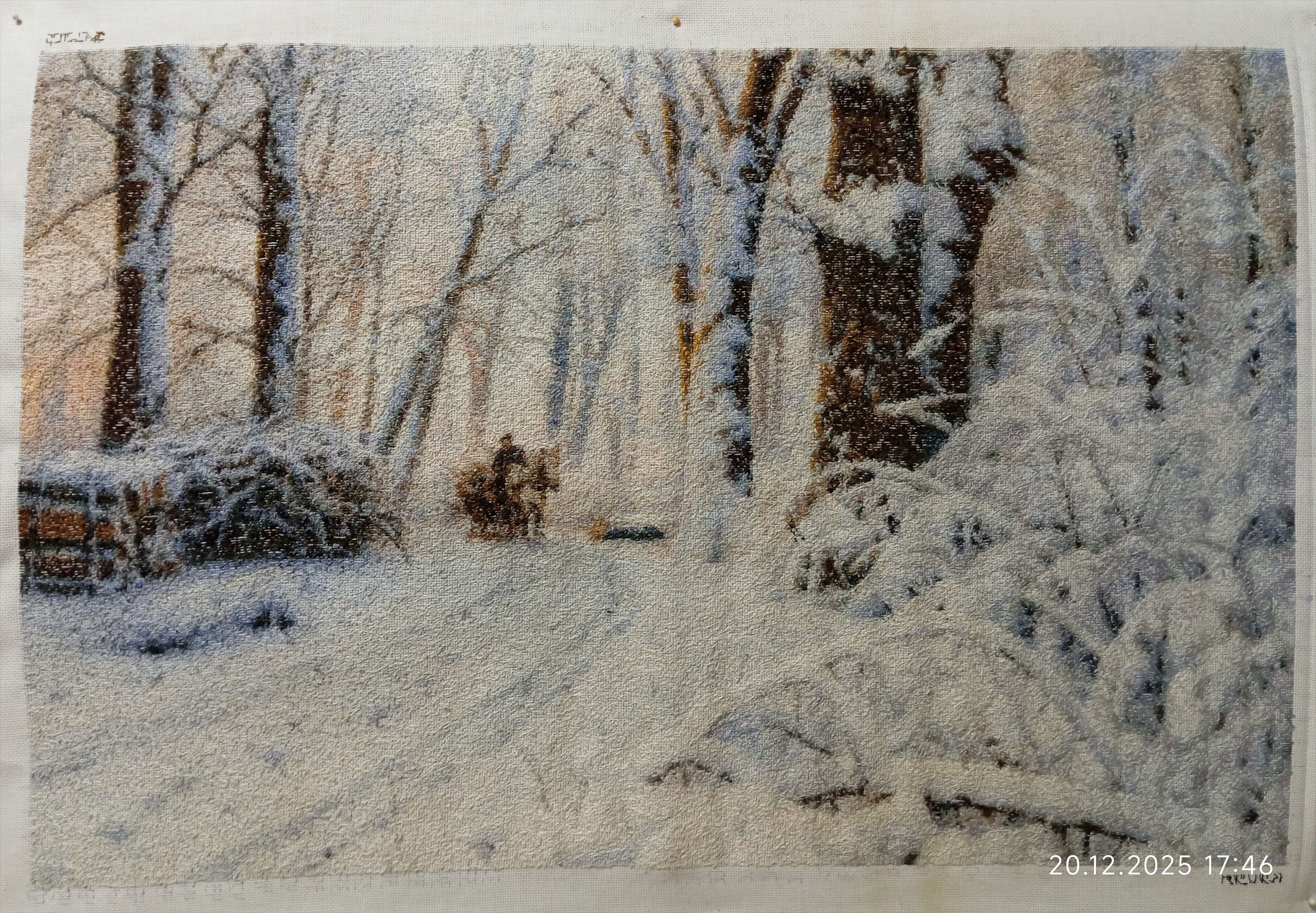| Добрый день! Ну, вот и всё: в декабре, за две недели до Нового года, у меня случился финиш моей картины 228 "Зимой в лесу" (м) по картине П. М. Монстеда, 500х336 стежков Вышивала ее на канве Аида 18ct.