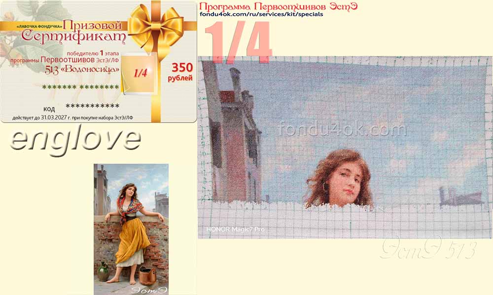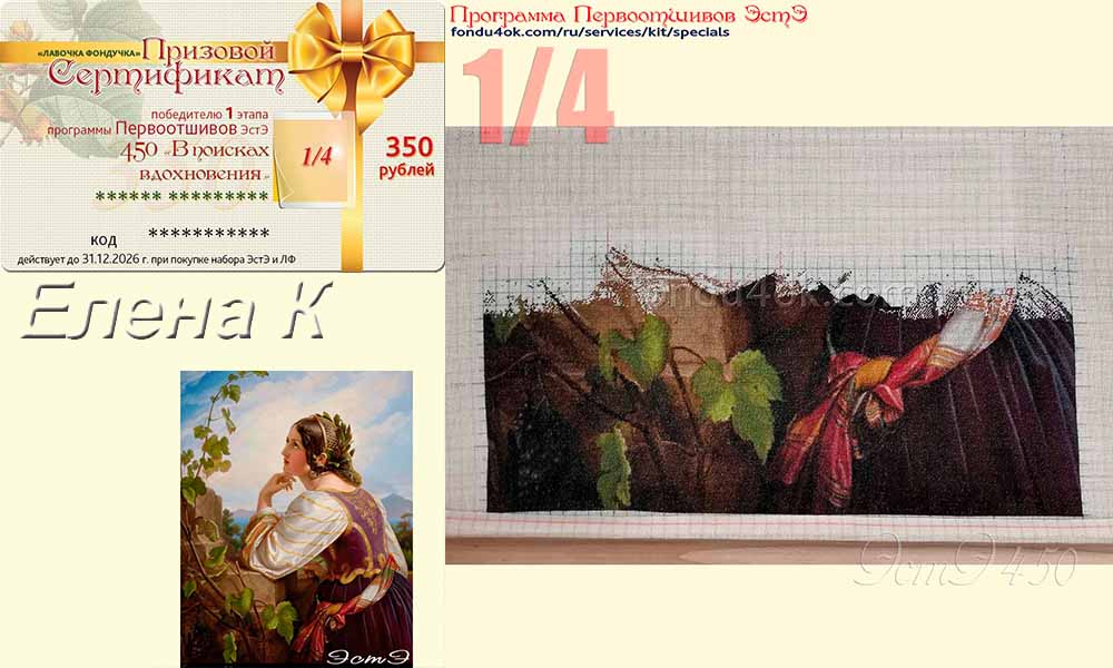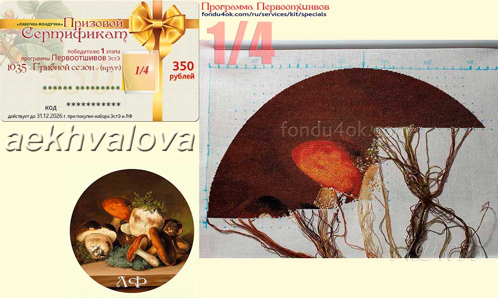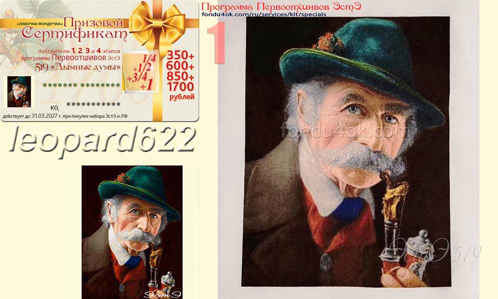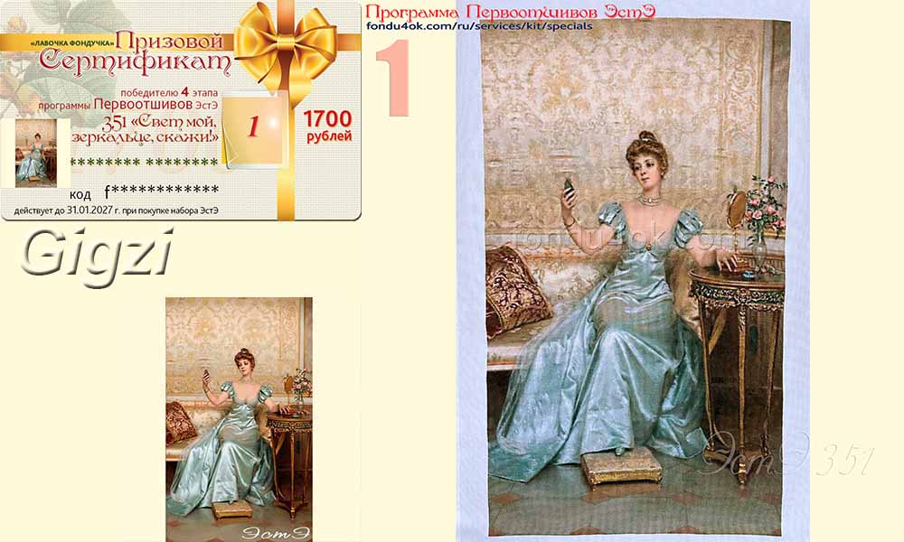 | Поскольку фирма заинтересована в скорейшем появлении готовых отшивов по нашим схемам, у нас существует Система Поощрения ПЕРВООТШИВОВ: С 1 января 2013 г Программа Первоотшивов распространяется на все схемы, у которых еще нет законченного отшива, представленного в Магазине, не зависимо от года выпуска схемы (схемы, часть отшива которых уже представлена, могут участвовать, начиная с этапа, следующего за представленным). - Первоотшивателем может стать каждый приобретатель набора (схемы). - Каждая схема будет иметь 4 этапа отшива:¼, ½, ¾, схема целиком (считая по листам, с округлением к меньшему) - Вышивальщица, первой закончившая этап (независимо от результатов предыдущих этапов), и предоставившая качественную и достоверную фотографию высокого разрешения своего отшива (по окончании процесса желательна профессиональная фотография вышивки без рамы + фото оформленной работы), получает денежный Приз в виде Призового Сертификата. призовой фонд составляет: за I этап – 350 рублей, за II этап – 600 рублей, за III этап – 850 рублей, за IV этап – 1700 рублей. (таким образом самая быстрая вышивальщица может получить за отшив своей схемы в общем случае сертификат на 3500 рублей) - фотографии отшивов участвующих в ПП используются для популяризации дизайнов, размещается в каталоге вышивок на сайте Лавочки Фондучка Примечание: Призовые Сертификаты по итогам этапов высылаются в электронном виде. Призовые сертификаты не действуют во время Акций интернет магазина. Внимание! В Программе Первоотшивов не участвуют: дизайны Архива, Индивидуальные Заказы, а также измененные производителем по запросу клиента схемы, которых нет в общей продаже.