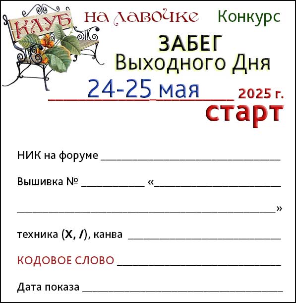 | Дорогие участники форума, члены и кандидаты Клуба-на-лавочке!Приглашаемк участию в малой ИГРЕ-КОНКУРСЕ 2025 года Забег Выходного Дня 24-25 мая!ПРАВИЛА и условия игрыЗапись продлится до 12.00 (мск) пятницы 23 мая 2025 годапо форме: Ник на форуме, Номер и Название вышивки ЭстЭ, размер схемы, техника вышивки (крест или петит/полукрест)