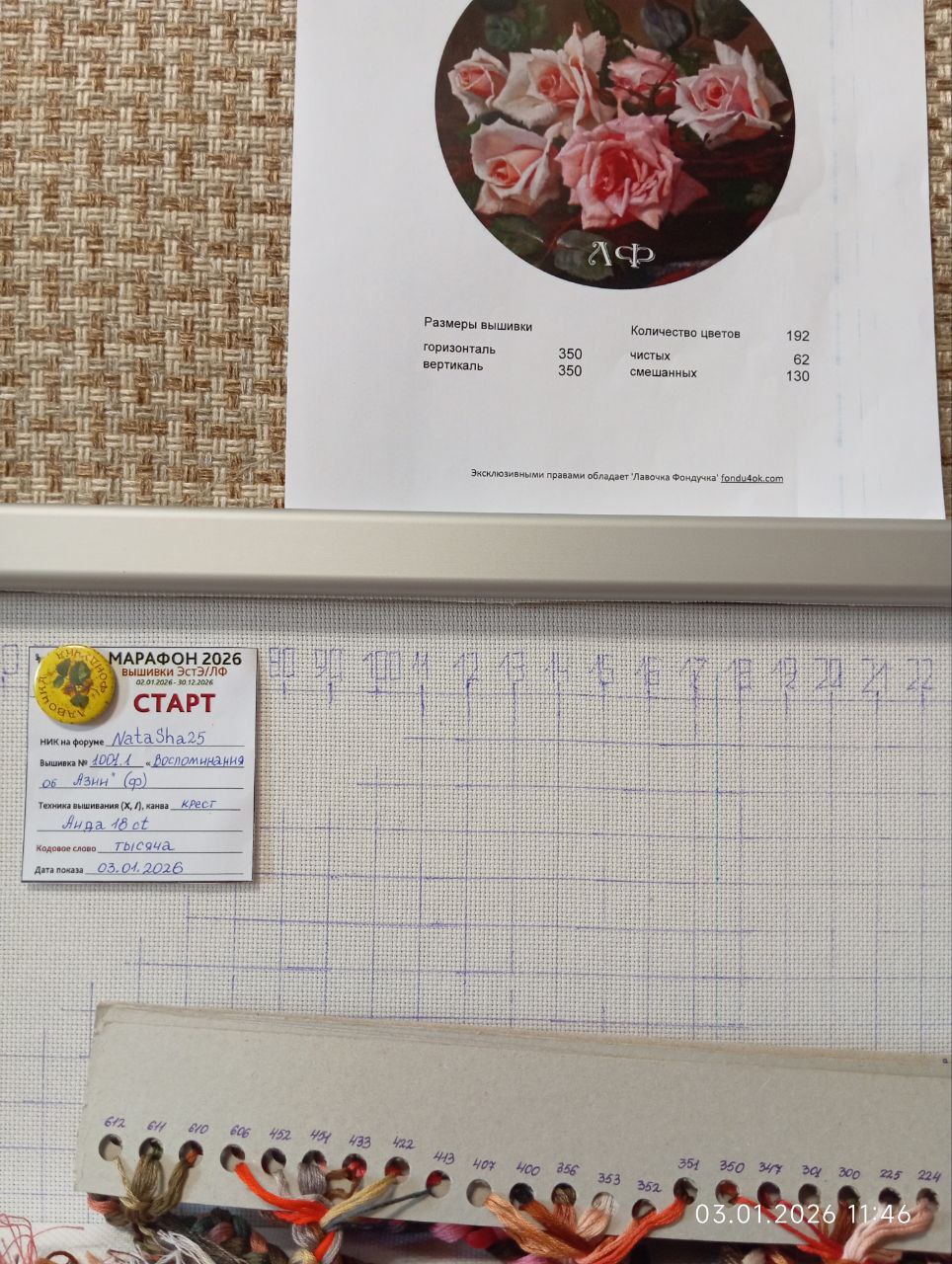 Добавлю сюда ещё пару стартовых фото уже со следующей датой (и уже с заправленной в раму и разлинованной канвой), так как, похоже, что на вчерашнем фото бирка плохо читается).