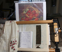 Вышито:ЯблокинаСеребряномблюде,ЧашкаМолока,ОбедСвиристеля,Розывстекляннойвазе,Идиллия,Натюрморт с цветамиипопугаем,Натюрмортсптичкой,Подсолнухи, Вышиваю 294 и 319