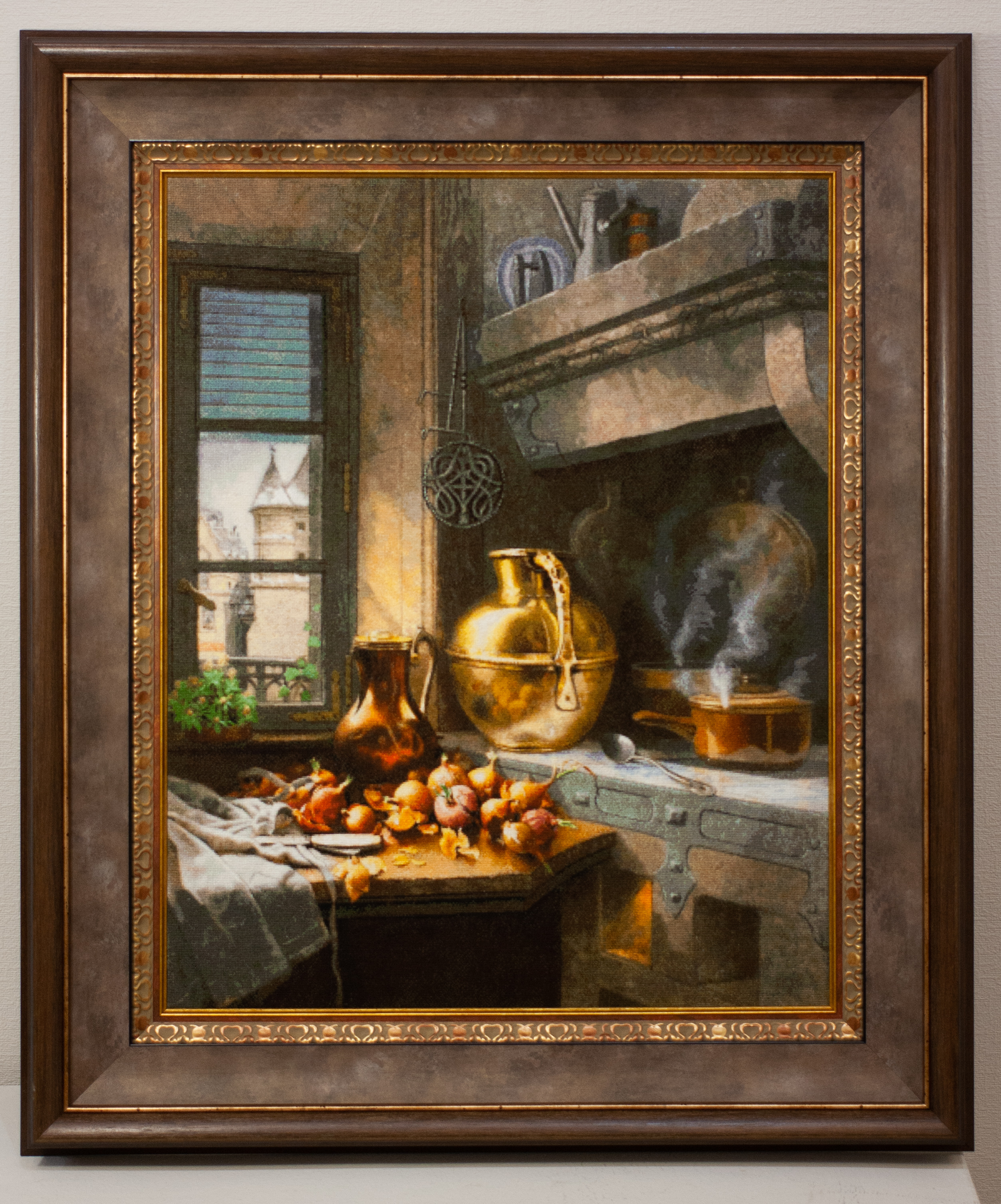 138 «Уголок на кухне» подарила Ольга Тельнова изУдмуртии по картине Эдвина Дикина. .. Как мы любим эту картину! Могу спорить, что большинство их висит на наших кухнях! Вышивать не столько сложно, сколько внимательно, чтобы лук отражался в кувшине, чтоб дым был прозрачным, а камень – резным. Посмотрите, все предметы одушевлены, каждая мелочьзначительна: где медный кувшин и тёплый пар становятся символами человеческого дома, самой идеи тепла и покоя. И картина пахнет варёным бульоном, свежим хлебом, древесным дымом и временем — временем, которое здесь не спешит.
