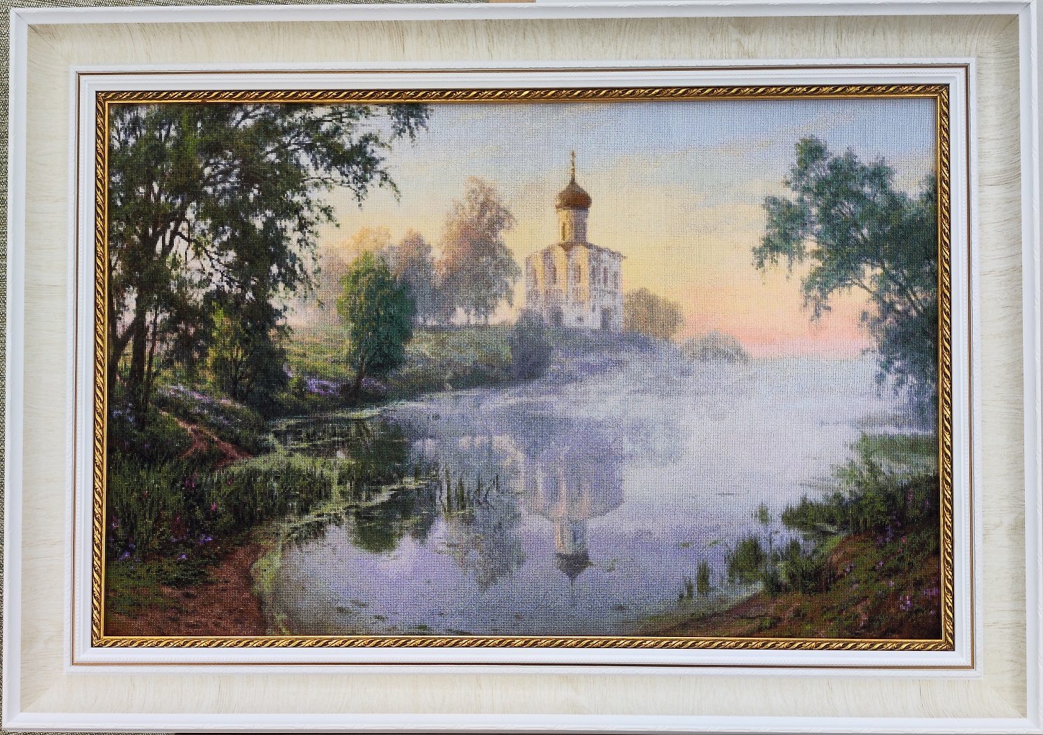 440 «Утро на Нерли» по картине Сергея Басова –этот очередной подарок Ольги Свидло из Кирово-Чепецка. Очень необычная картина, немного загадочная, как и все, где есть туман. И, казалось бы, четкий здесь только первый план. А дальше все слегка размыто: отражение в воде, туман, деревья на дальнем плане, сама церковь.. Но это не дает нам права расслабиться, чтобы на картине осталось туманное утро, а не просто размазня…Церковь на Нерли в русской культуре — символдуховной чистоты, мира и гармонии. В картине она не воспринимается как архитектурный объект — это центр мира, ось, соединяющая землю, воду и небо. Её отражение в воде — словно образ второй реальности, духовной, невидимой, но присутствующей. Туман — как грань между этими мирами, мягкая завеса между материальным и вечным. И мы, глядя на это, чувствуем умиротворение, внутренний покой, похожий на благословение.