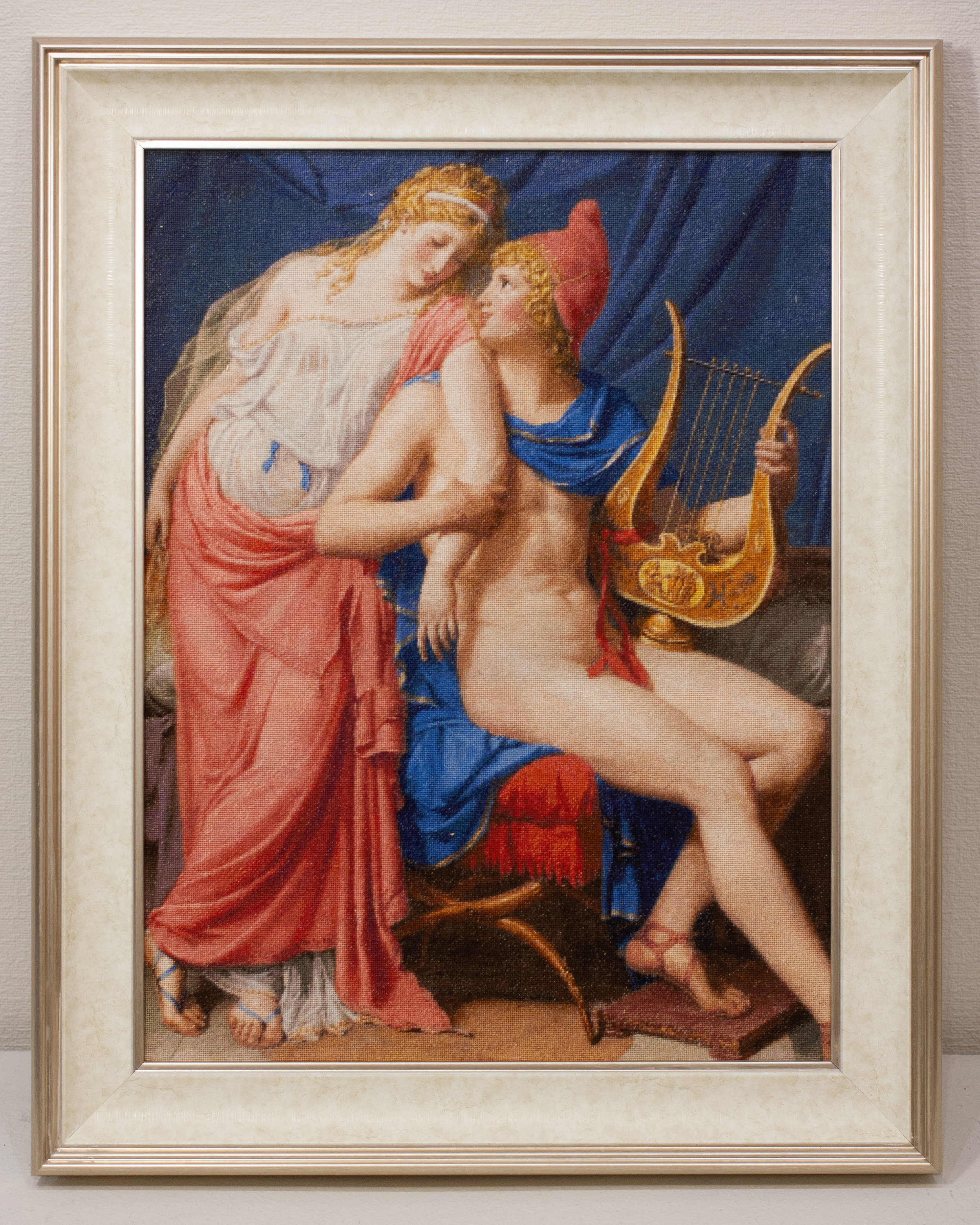 172 Парис и Елена – фрагмент по картине Жака-ЛуиДавида, вышитая Ириной Артюхиной из Люберец. Это воплощение античной гармонии и идеала любви, написанное с почти музыкальной ясностью. Эта встреча — начало конца: именно из этой нежности, из этого взгляда родится великая катастрофа: за внешним покоем скрыт предчувствуемый рок — ведь именно эта встреча приведёт к Троянской войне.Вышивать относительно не сложно, больше внимания кмелким деталям: арфа, волосы, сандалии, узор на одежде…