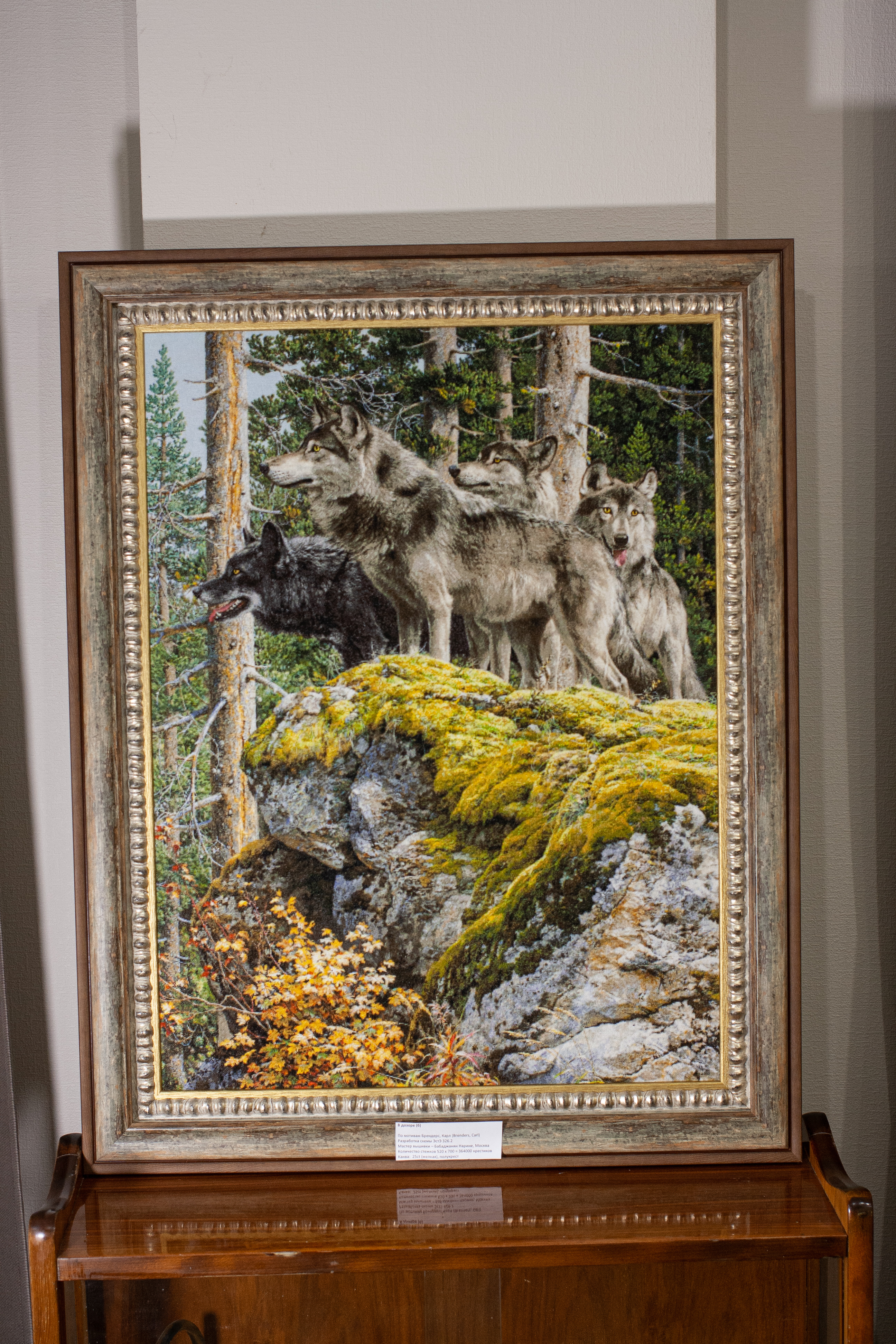 326.2 Роскошную стаю волков «В дозоре»гиперреалистично написал бельгийский художник Карл Брендерс, а вышила их для нашего фонда Нарине Бабаджанян из Москвы. Вышивать сложно везде: и хвоя, и шерсть, и мох, и листья, и скала… Получается просто шикарная картина!Все детали выходят невероятно точно: фактуракамня, мягкость мха, густота шерсти,игра света на хвое, создают ощущение почти документального присутствия в северном лесу.