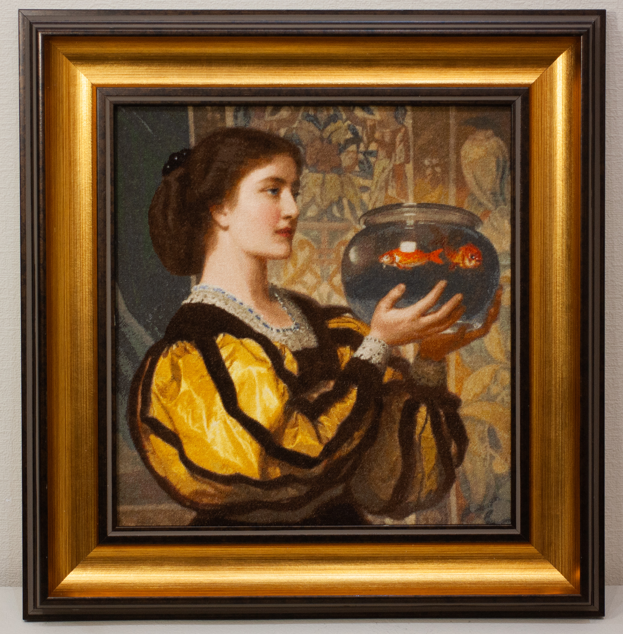494 «Чаша с золотыми рыбками» вышита СветланойСысоевой из Благовещенска. Это фрагмент картины Чарльза Эдварда Перуджини. Вышивать воротник и манжеты – сложно, узор на стене и рыбок – внимательно. Остальное – нормально. Эта картина располагает к раздумью и медитации. Она– как диалог между женщиной и хрупким чудом жизни, заключённым в стеклянную сферу. Она о том, как человек смотрит на жизнь,боясь нарушить её покой. О том, как вечность может уместиться в ладонях. О том, что иногда — чтобы понять себя — достаточно взглянуть в прозрачную тишину.