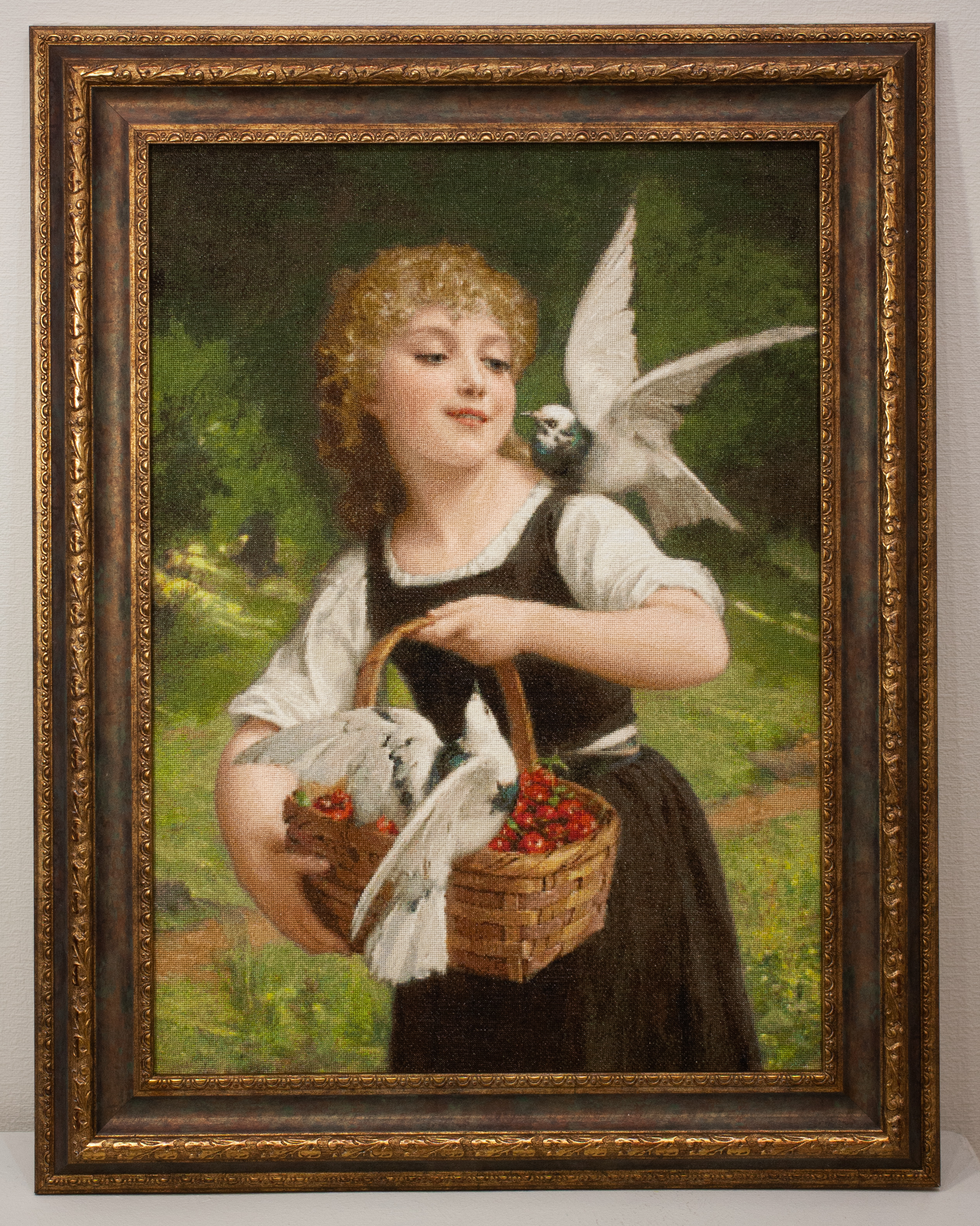 482 «Голубиную любовь» вышила Ирина Лемзина изКалужской области по картине Эмиля Мунье. Вышивать не сложно, но конечно, на мелких деталях задерживаемся подольше (лицо, ягоды, птицы, корзина). Картина словно впитала аромат детства и нежностьчеловеческой души. Это — воплощение той естественной гармонии, к которой стремится взрослая душа, но редко достигает, которую мы, взрослея, называем «утраченной простотой».