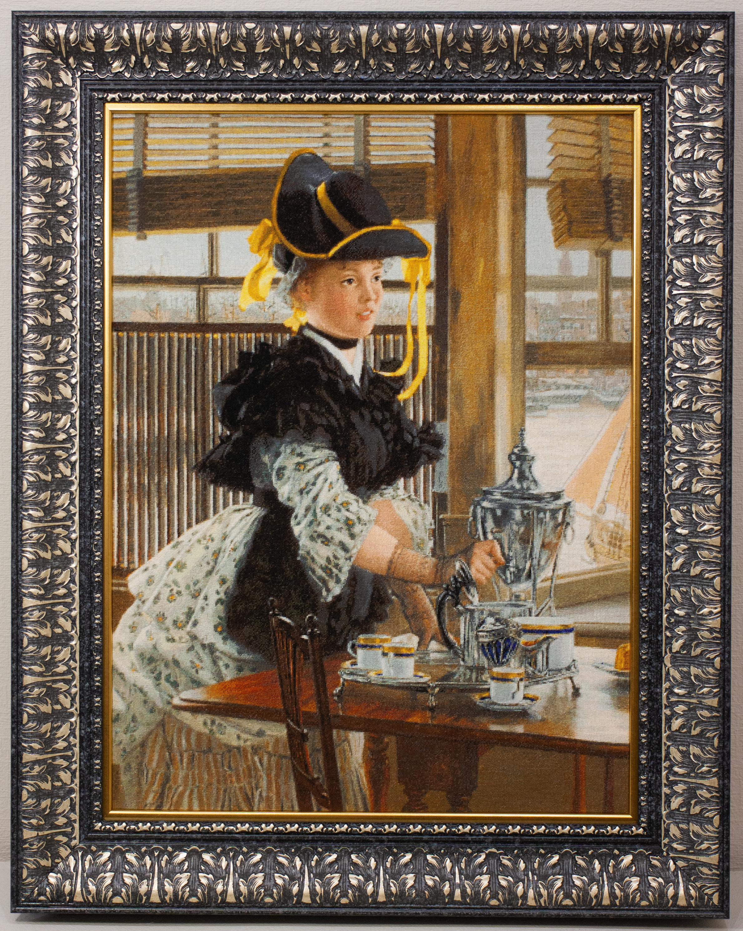 |  233 Вечерний чай – по картине Джеймса Тиссо,вышила для нашего фонда Светлана Кузина из Минска. Не самая легкая в вышивке работа: посуда, перчатки, одежда, жалюзи… К этой картине подходит множество багетов, мы выбрали этот – он сразу подчеркнул посуду, платье, фон и золотые ленты ее шляпы. И вот в Ваш дом вошел XIX век, среди шелеста волн и шума далекого города, —можно почти услышать тихий звон серебра и шорох платья, как аккомпанемент к тихому счастью, которое не нуждается в словах.