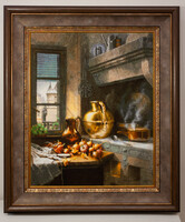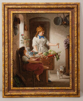 463 «Кухонная идиллия» кисти Антона Эберта,иголочки Елены Куценко из Новокузнецка. Еще очаровательный сюжет для кухни! Здесь придется задержатся на корзинках, кошачьей мордахе, куче овощей, посуде на стене… Перед нами распахиваетсядверь в тихий уголок прошлого — туда, где жизнь течёт размеренно, где запахи хлеба и свежих овощей смешиваются с детским смехом и солнечным светом, падающим из окна. Персонажи не позируют — они просто существуют, здесь нет события, здесь просто состояние, которое и есть настоящая идиллия: не в празднике, а в тихом счастье быть вместе.