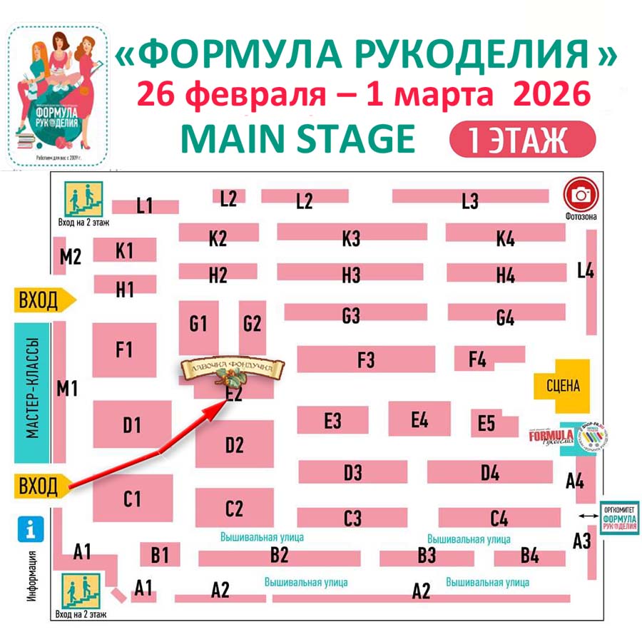 Ждут встречи с вами На ВЕСЕННЕЙ выставке «Формула Рукоделия»! Место проведения: Концертно-выставочный зал Main Stage. Наш стенд в павильоне под номером Е2